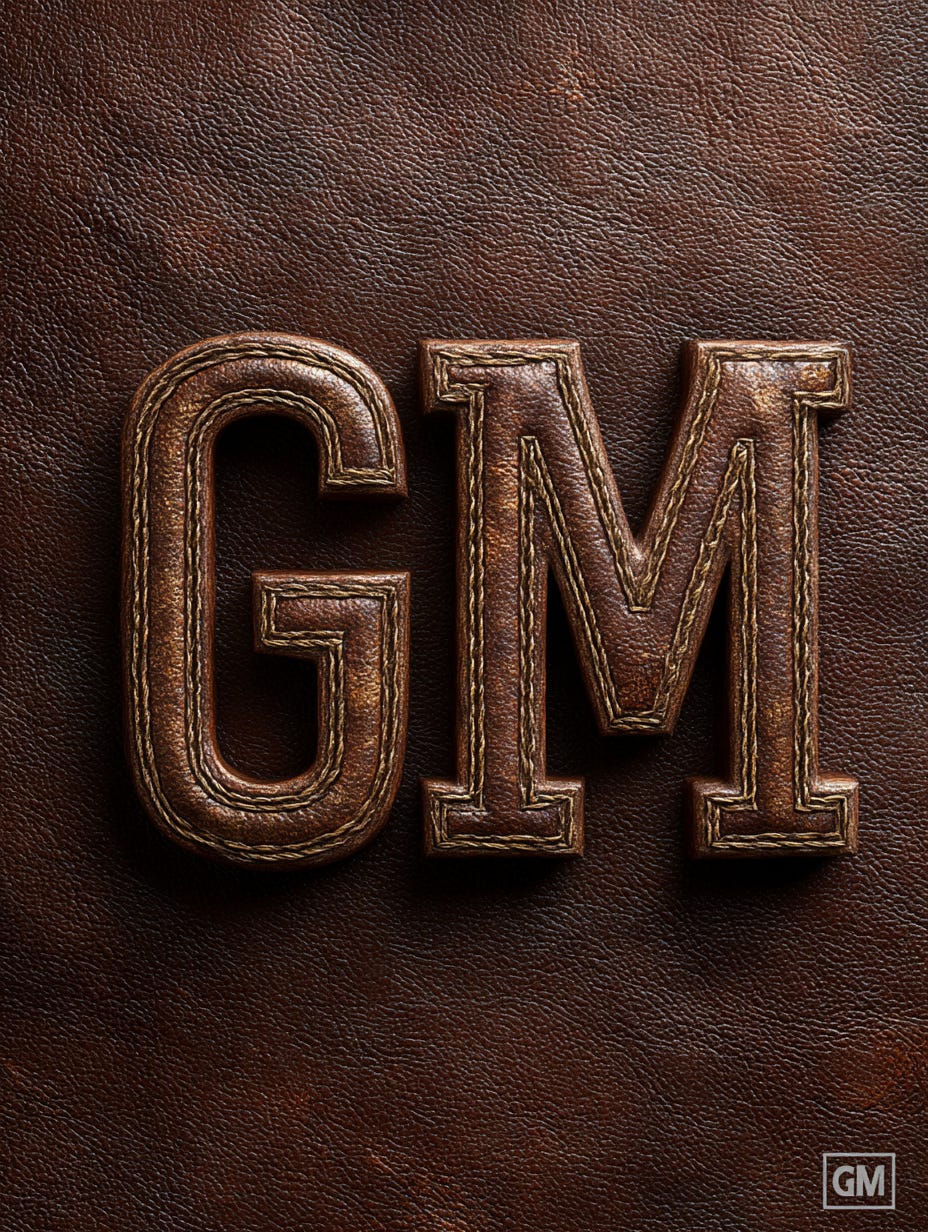 Icon design of letters "GM" made of leather, hyperrealistic, hyperdetail, front view, studio lighting, 100mm lens, colored solid background --ar 3:4 --v 7