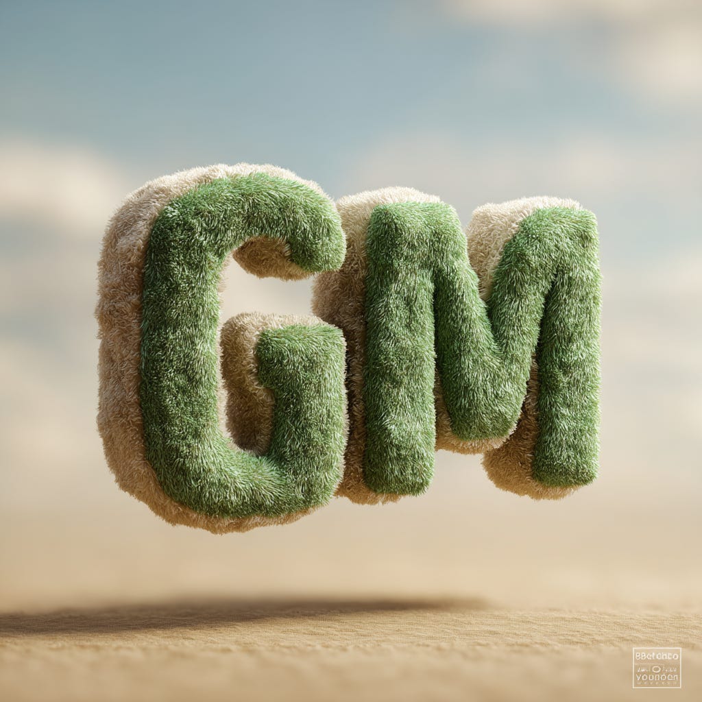 Retro shot of a letters "GM" sculpted from soft, plush fabric, floating in midair with a green #66B660 . Retro film grain adds nostalgia, isolated on a light background, cozy and ethereal --ar 1:1 --v 7