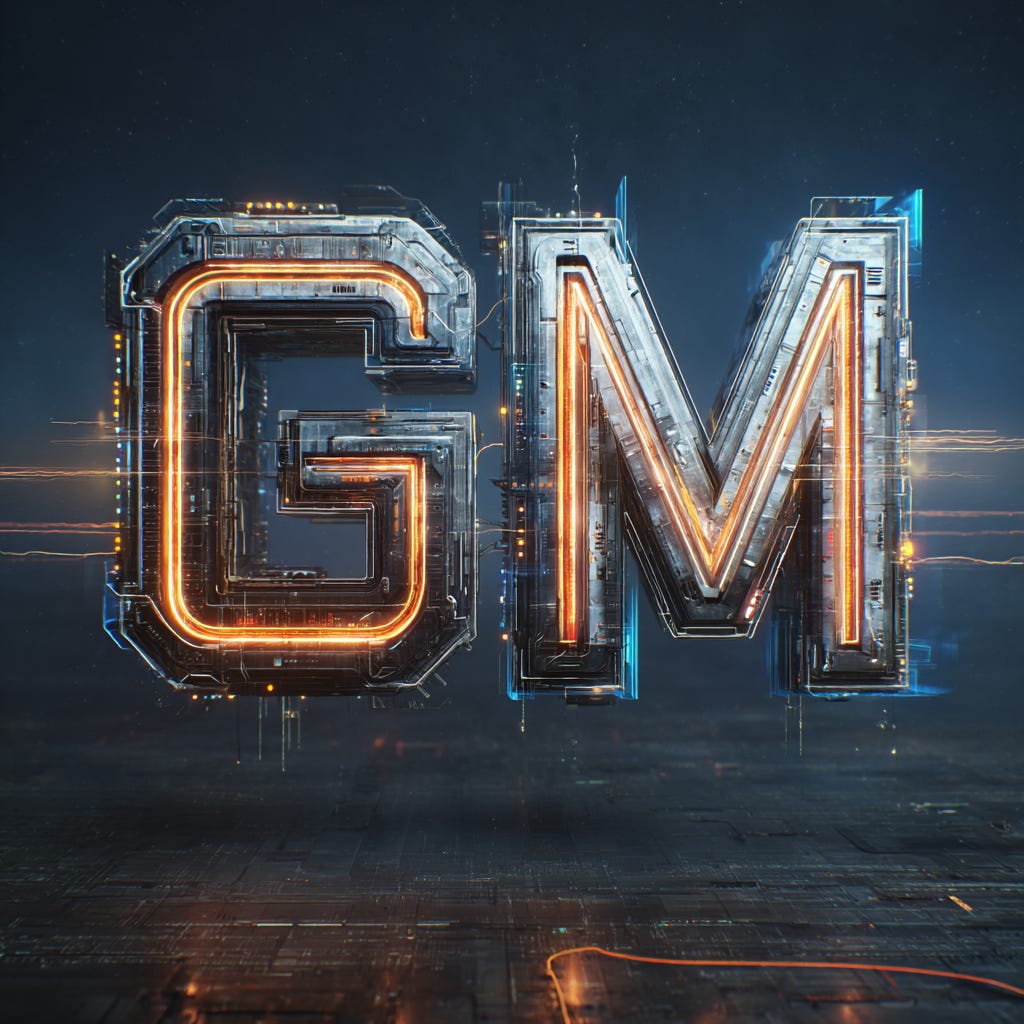 Letters "GM" made of glowing plasma and metal, hovering inside a sci-fi reactor core, electricity arcs, high-tech energy lines, futuristic tones, blue-orange color scheme --ar 1:1 --v 7