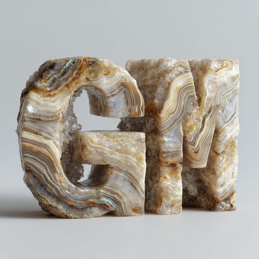 icon design of letter "GM", made of Agate, Earthy, banded patterns in various tones, hyperrealistic, hyperdetail, front view, 80mm lens, studio lighting, white solid background. --ar 1:1 --raw --profile 3m1vngz --v 7