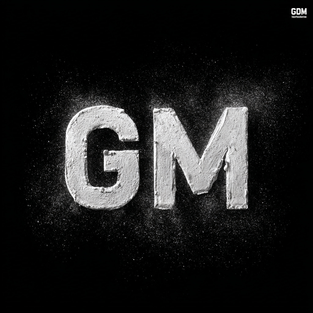 The letters "GM" made in the form of prints of white paint on a black background. The letter should have a clear and detailed texture that reflects the ink prints. Front view with high resolution and high-quality focus, without shadows and reflections. Make sure that the paint looks fresh, with natural nuances of white to convey the richness of its texture. --v 7