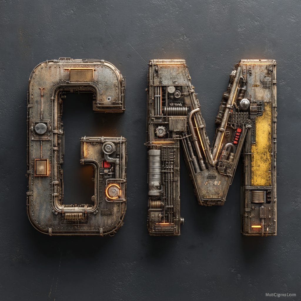 3D rendering, industrial design of the letters "GM", cyberpunk style, mechanical structure made from steel and metal parts, black background with metallic texture and reflective surface material, centered composition, symmetrical, cinematic lighting, high resolution, hyper-realistic details, metallic textures, shadows, ambient light, octane render, blender, --ar 1:1 --stylize 250 --v 7