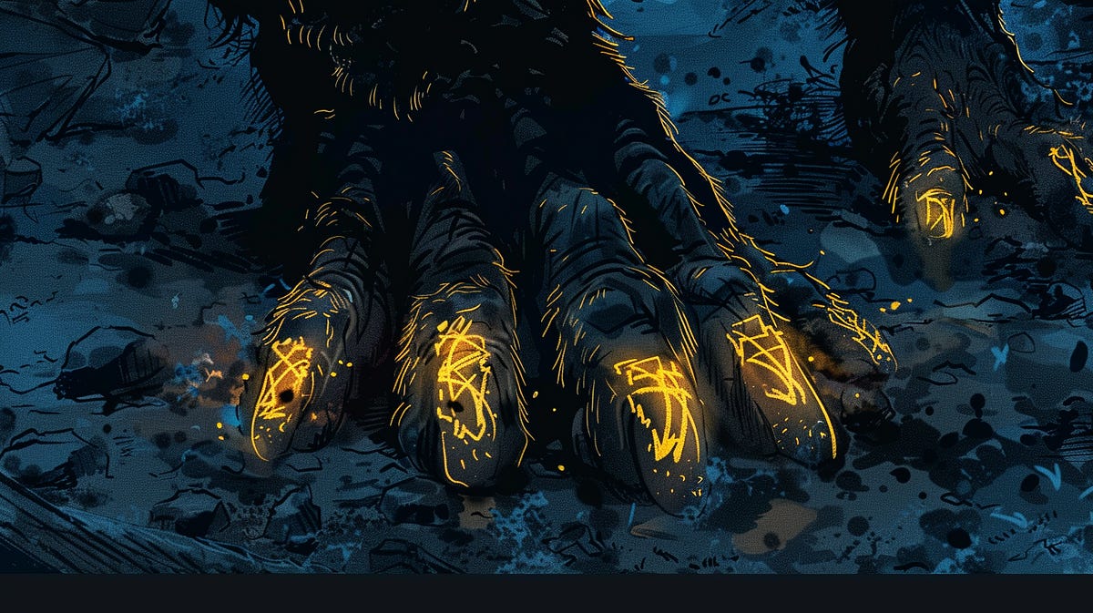 A black beast’s foot with yellow runes on it, frontal view, close-up