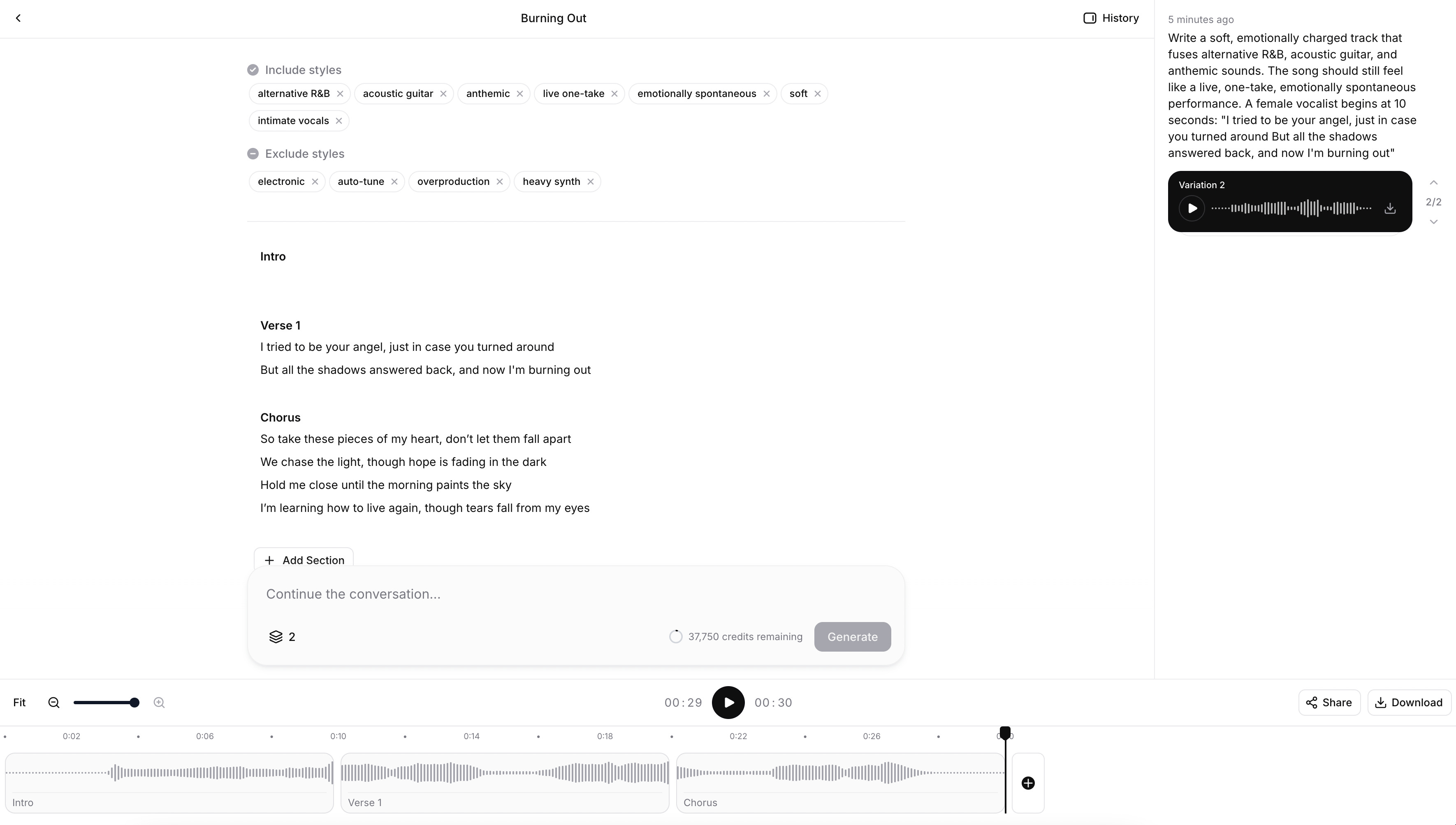 Let’s try an initial prompt with a duration of 30s, and add some lyrics: