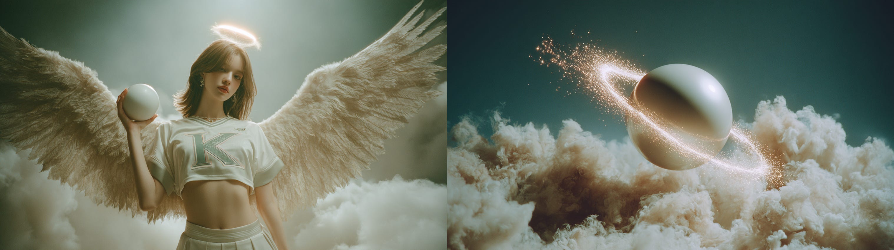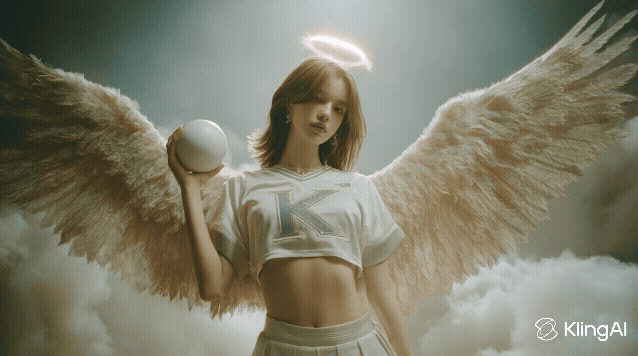Video Prompt: Winged female angel in a celestial cloudscape gently kisses the glowing white orb, then hurls it skyward with divine grace. The orb arcs through fluffy clouds, colliding with a solitary halo mid-air in a burst of radiant light and trailing golden sparks, the camera remaining stationary as cosmic energy ripples through the atmosphere.