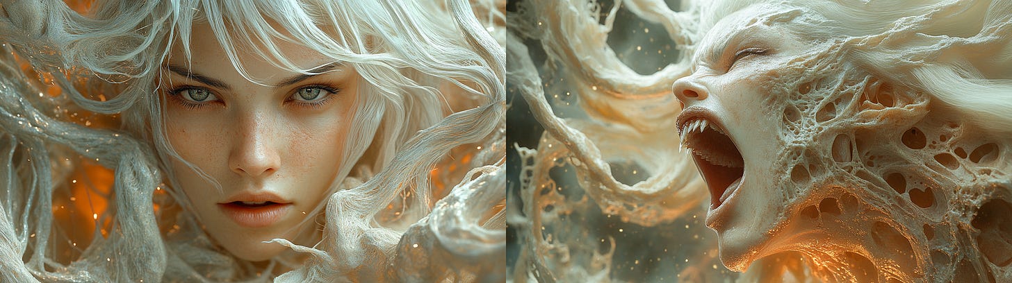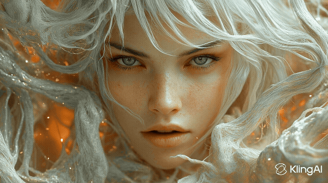 Video Prompt: The woman's face transitions from serene to monstrous, her white hair unraveling wildly as her skin dissolves into molten textures, the warm orange glow darkening into chaotic shadows with glowing accents, the camera stationary capturing her veil disintegrating amidst rising tension.