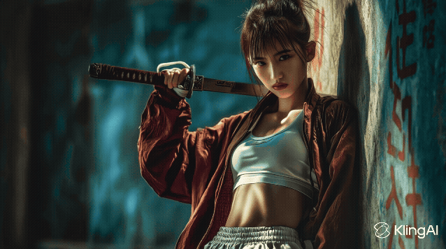 Video Prompt: Chinese woman stands on a graffiti-covered rooftop gripping her sword, then leaps into a dynamic mid-air martial arts pose with the blade thrust forward, her hair whipping freely as the camera follows her powerful motion from rooftop descent to airborne strike.