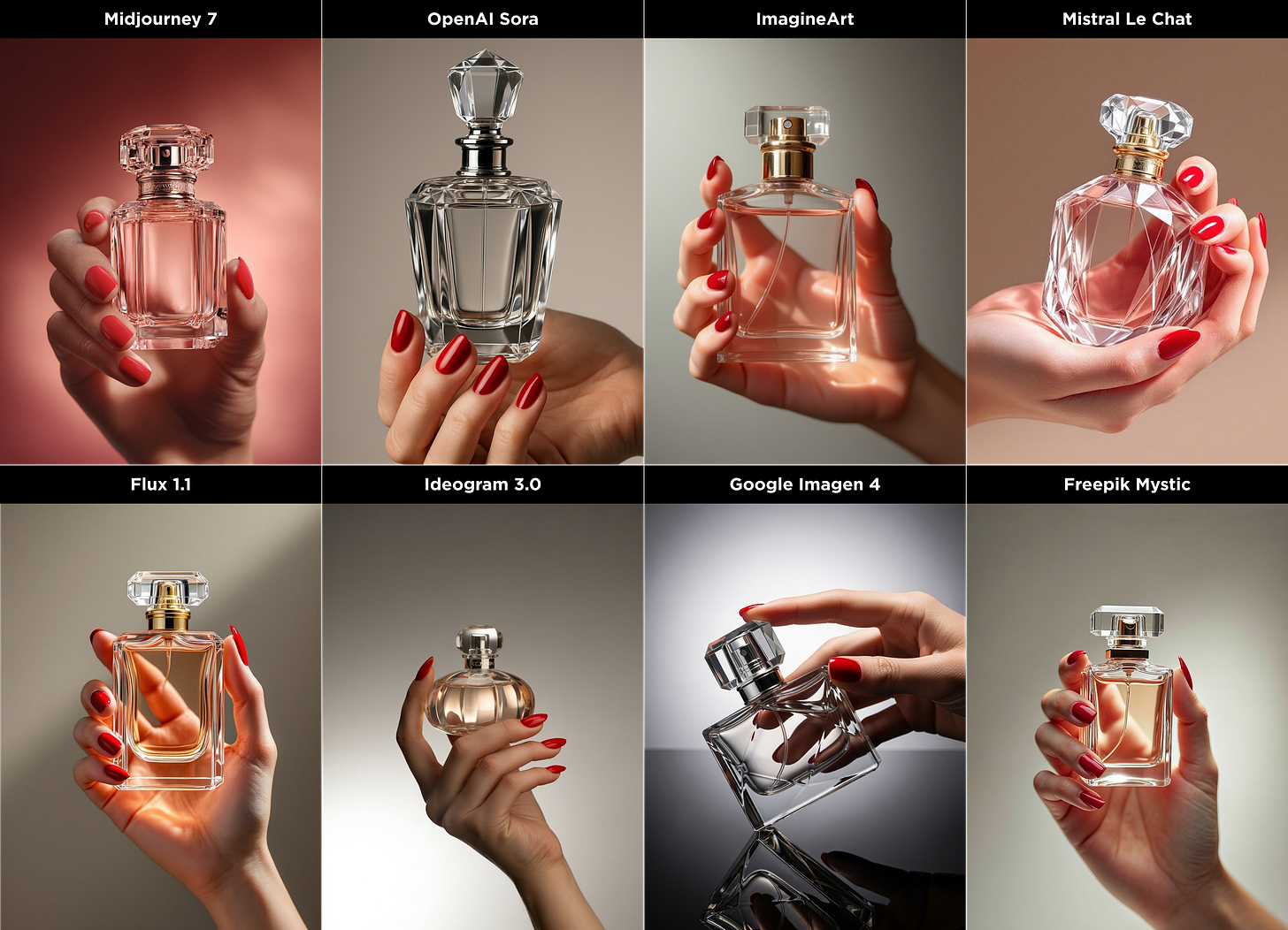 High-end studio product photography of a crystal perfume bottle, delicately held in a woman's hand with manicured red nails, soft studio lighting, ultra-high resolution, hyper-realistic reflections, shot with a Canon EOS R5, neutral gradient backdrop, elegant and polished composition, commercial-grade detail