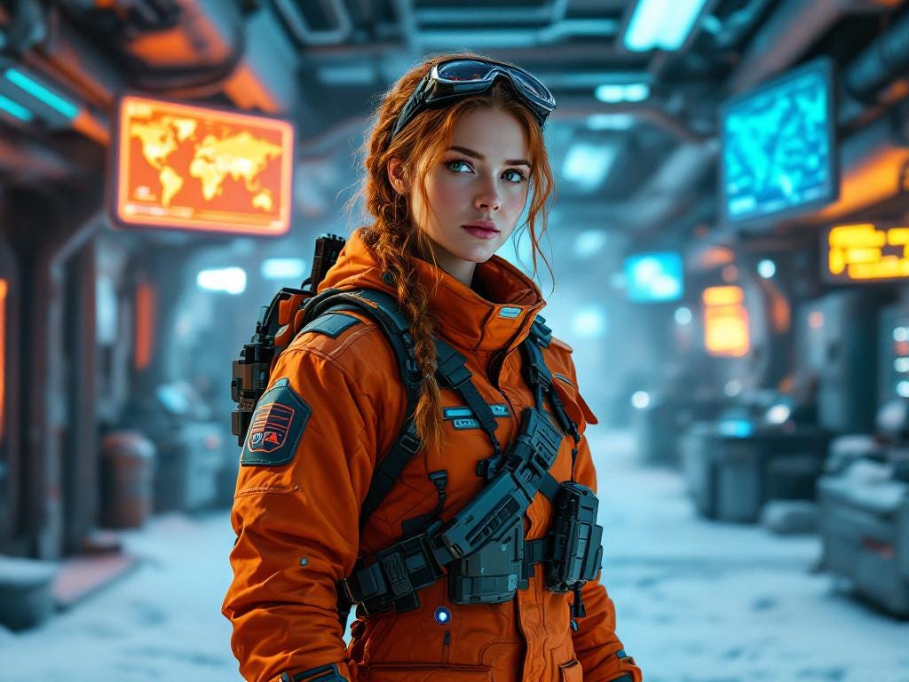 Prompt: A full-body, photorealistic image of a 20s Nordic woman with auburn hair in a braid, fair skin, and green eyes. Her face is realistic and warmly lit. She wears a bright orange and teal tactical explorer suit with a digital crossbow slung over her shoulder and goggles on her head. She stands in a snowy cyberpunk resistance base with holographic maps and data terminals glowing behind her.