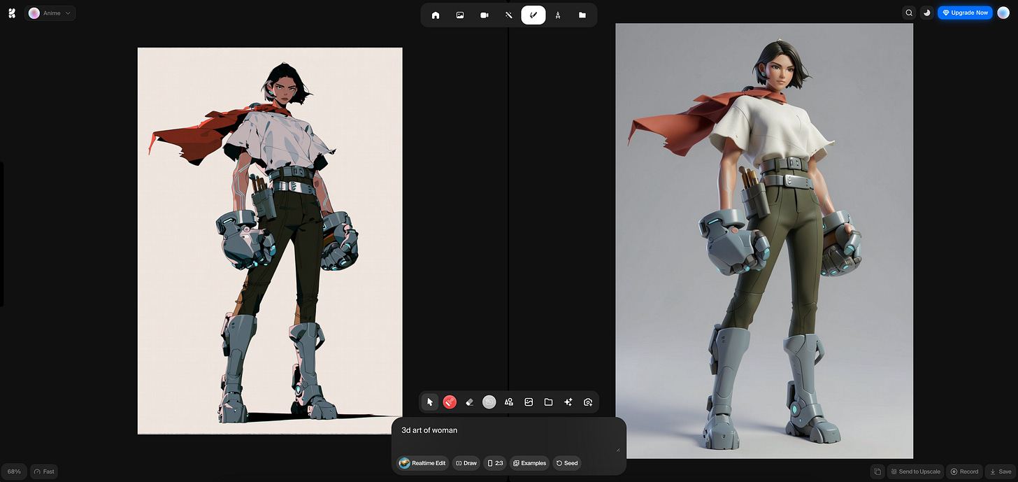 But with Krea’s new Realtime Edit engine, picking up a pencil (or a mouse, or a stylus) is no longer a chore, it’s a superpower. In five minutes, I went from 'stick-figure scribbler' to 'cyberpunk concept artist.'