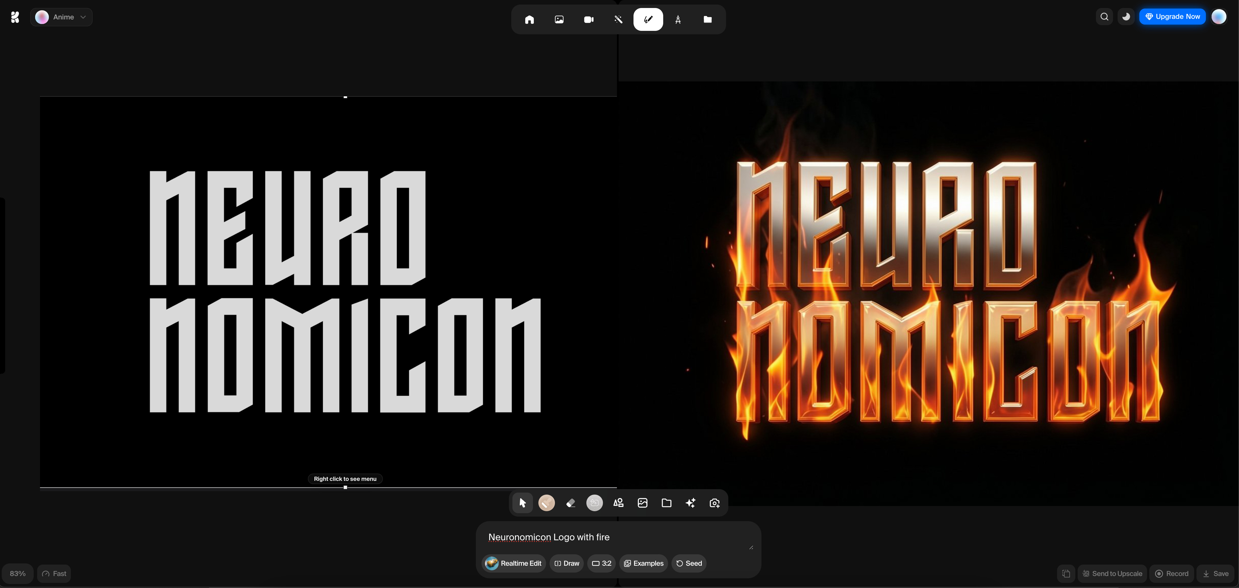 The Analysis: I started with a flat, white-on-black text logo. In real-time, as I added the prompt, Krea wrapped the typography in realistic volumetric flames. It didn’t just place fire behind the text; it integrated the glow and the metallic reflections onto the letters themselves, turning a flat asset into a cinematic title card instantly.