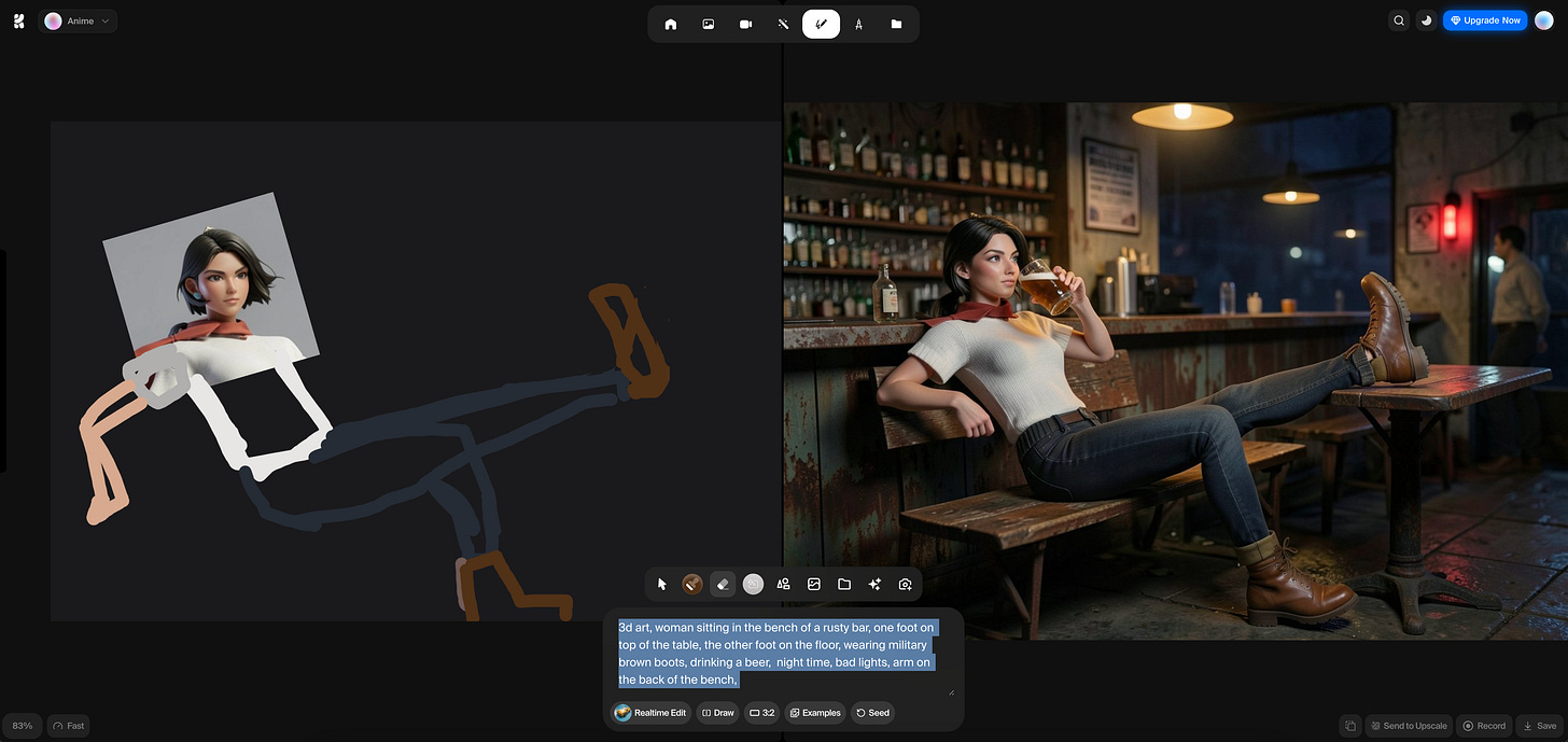 The Analysis: This shows Krea’s ability to “fill in the gaps.” It took the character’s face and projected it onto the body I sketched. It understood the physics of the leg resting on the table and translated my dark scribbles into a moody, atmospheric bar scene with realistic lighting and depth.