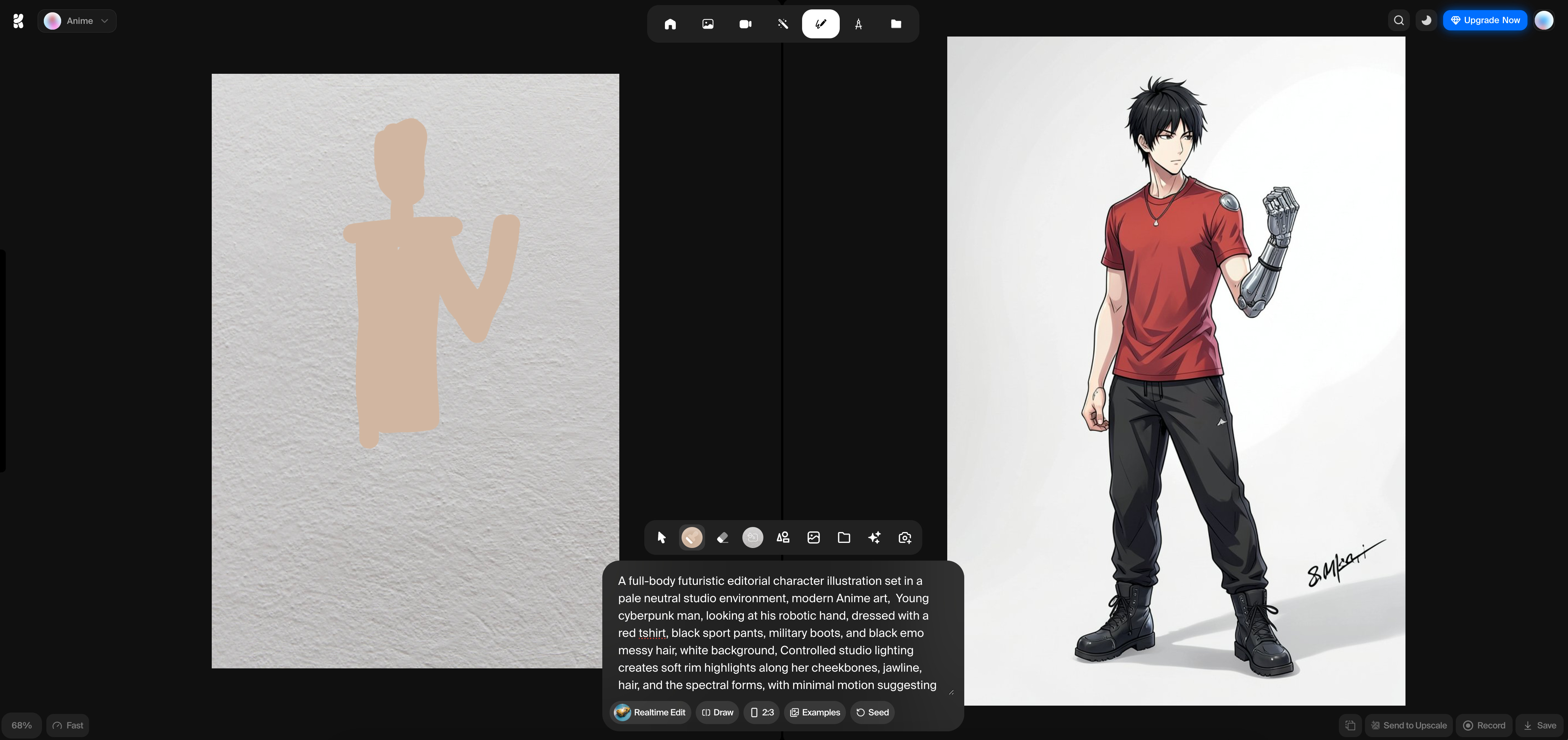 The Result: Despite my drawing being little more than a “blob,” Krea used the sketch as a positional guide. It understood that the “arm” I drew was where the robotic hand should be. The result is a clean, professional anime-style character that perfectly matches the complex lighting and fashion cues requested in the prompt.