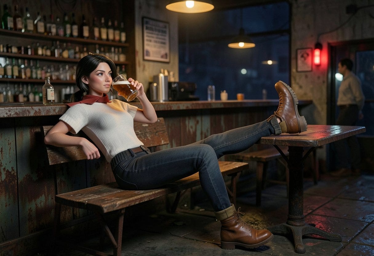 The Prompt: 3d art, woman sitting in the bench of a rusty bar, one foot on top of the table, the other foot on the floor, wearing military brown boots, drinking a beer, night time, bad lights, arm on the back of the bench.