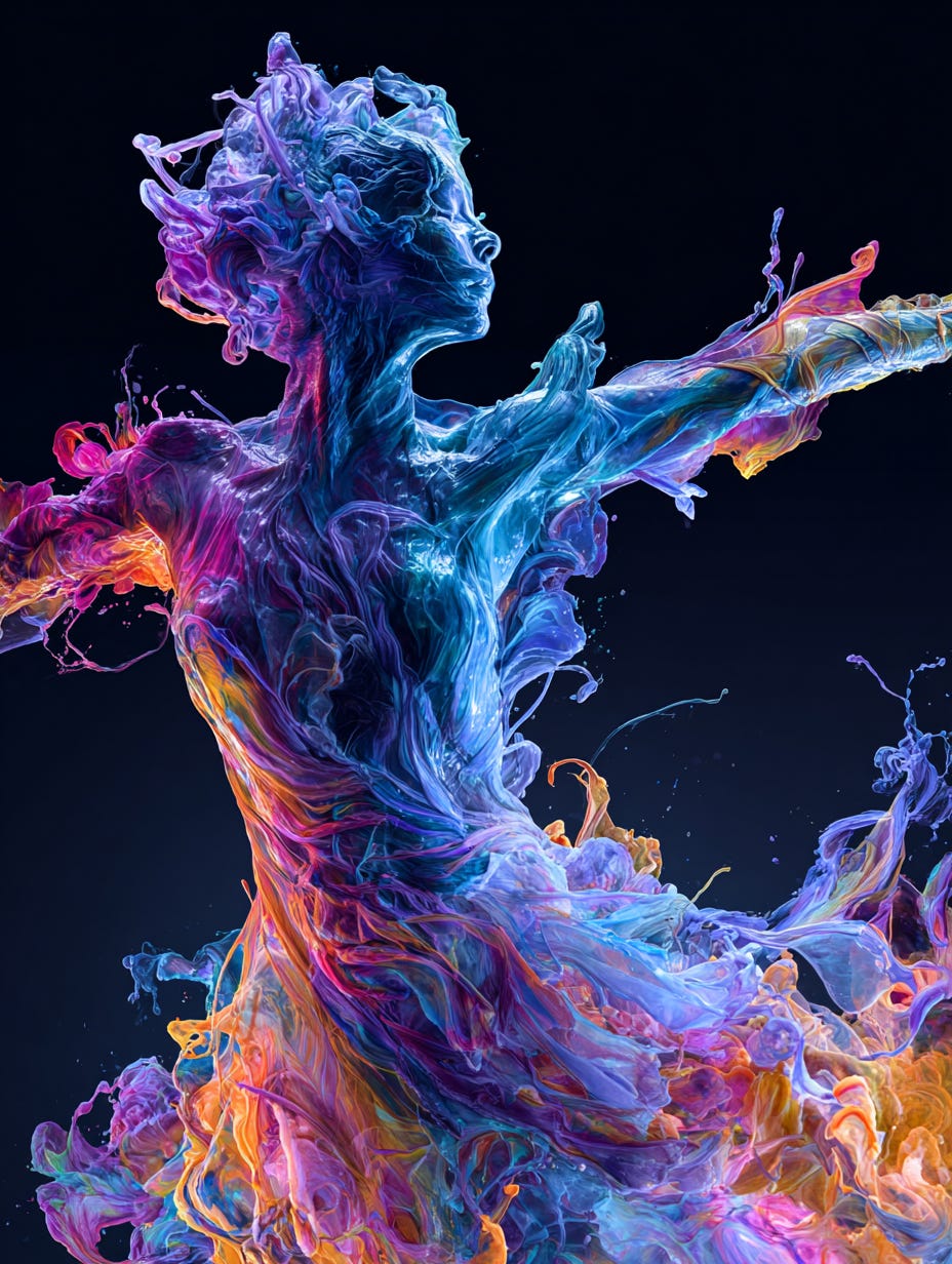Professional camera shoot, close up, upper torso of a dancing woman dressed with thin liquid resin pour with alcohol ink, abstract, psychedelic design, reflective surface, splashing, swirls, electric colors, clear acrylic pour with colored inks, dream-like imagery, black flat background, studio lights --ar 3:4 —v 7