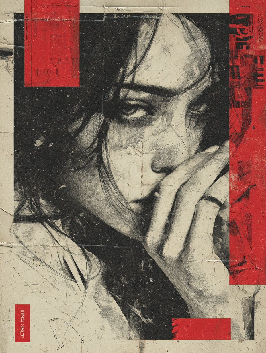 Midjourney Prompt: Spacepunk woman in grief, japanese ink and double exposure design with red block signature, Love, Temptation, Shy, Dark, --ar 3:4