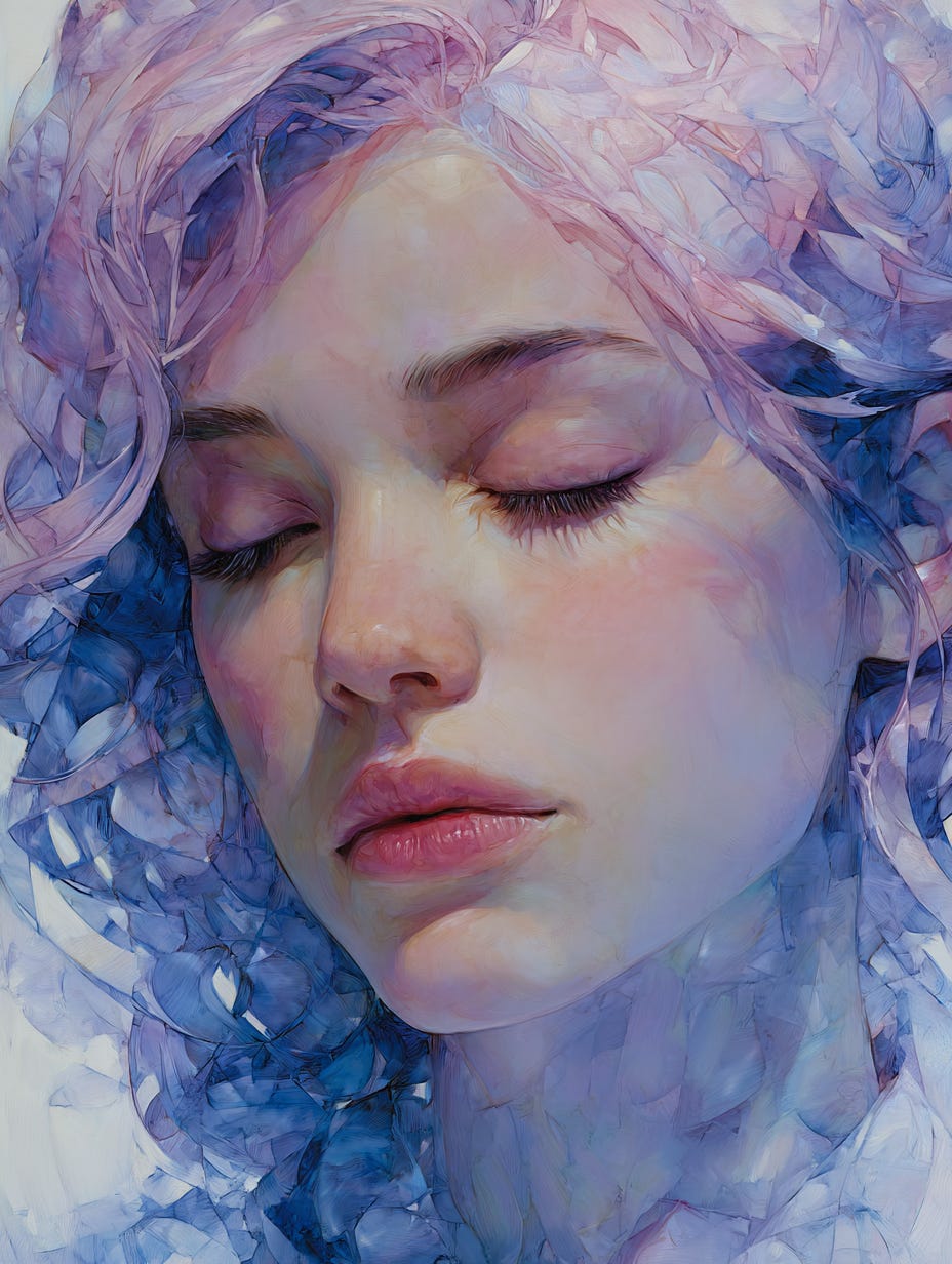 Midjourney Prompt: An ethereal watercolor portrait of a dreaming women blending soft washes of pink and blue. The dreamy, flowing strokes create an abstract, ever-changing landscape that feels both intimate and otherworldly. --ar 3:4 --exp 10 --stylize 250