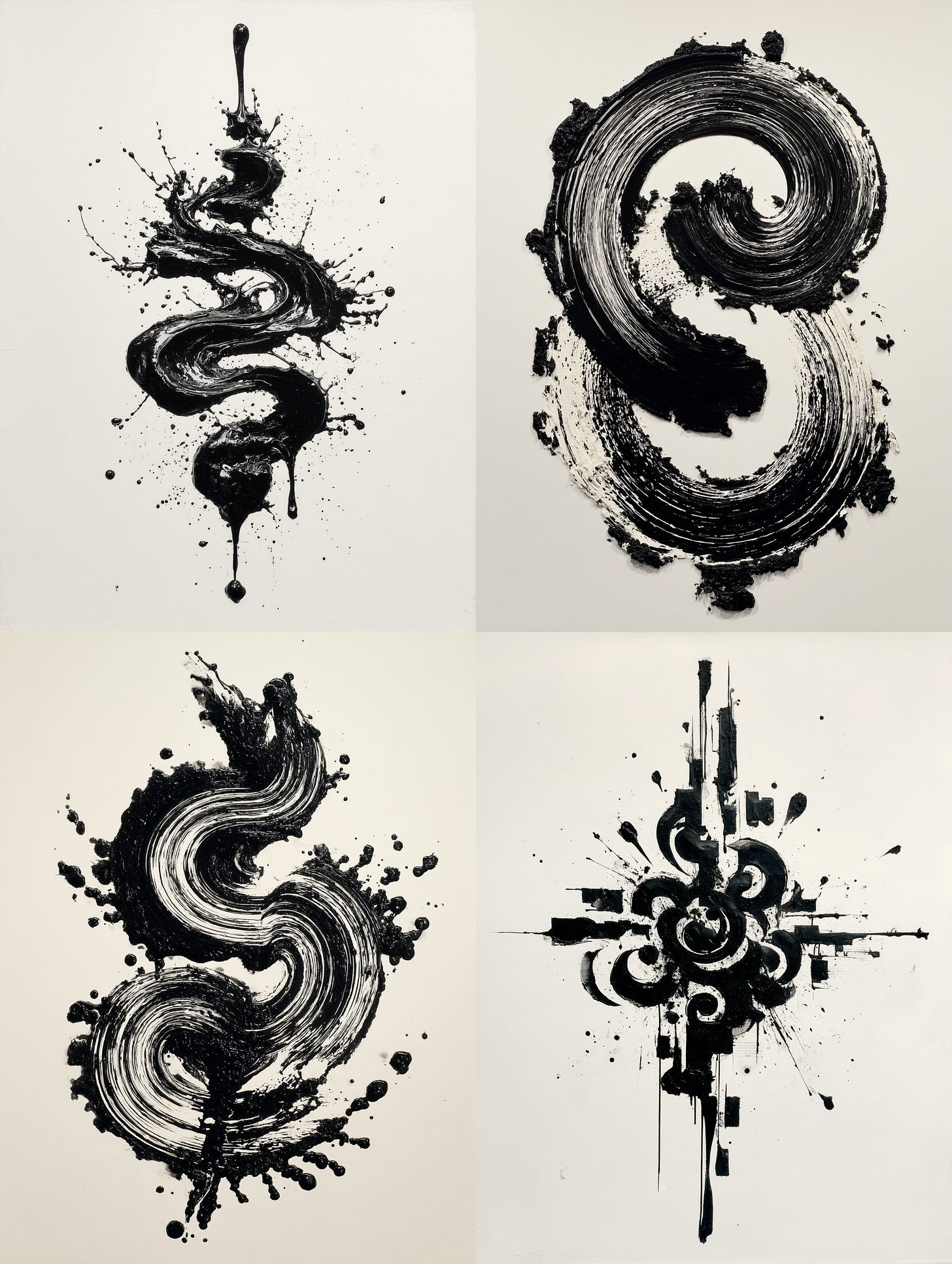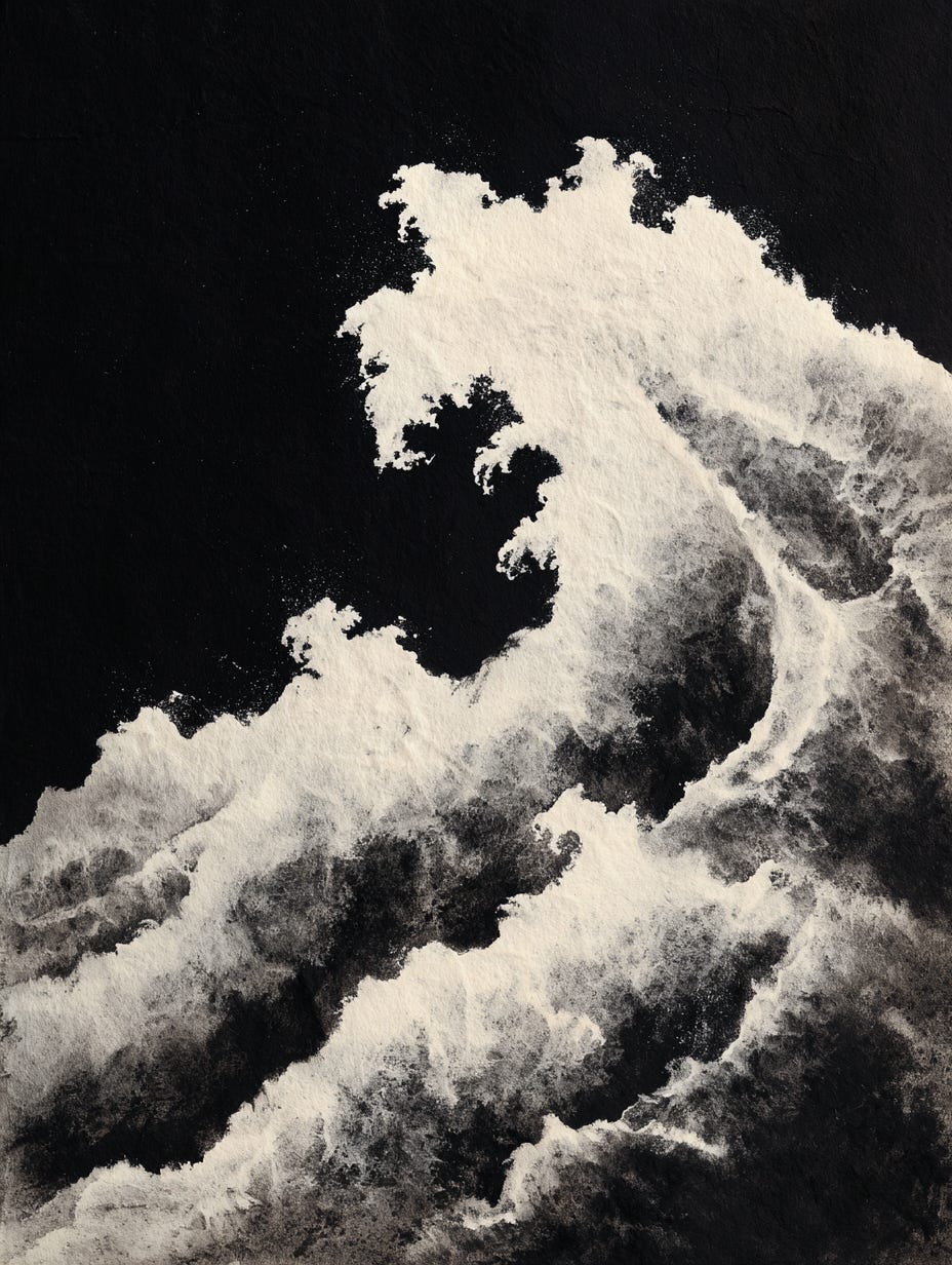 Midjourney Prompt: Powerful ink painting of crashing waves on traditional hanji paper, bold brush strokes, dynamic movement, strong contrast of black ink on rice paper texture, East Asian sumi-e style, dramatic lighting on black background, minimalist yet expressive, high-resolution --ar 3:4 —v 7