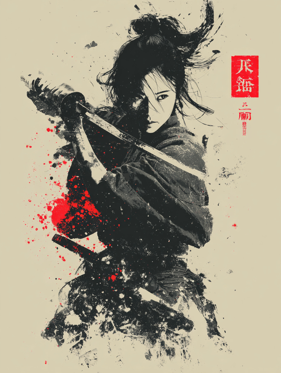 Midjourney Prompt: Japanese girl waving a katana, chiaroscuro, ink splash