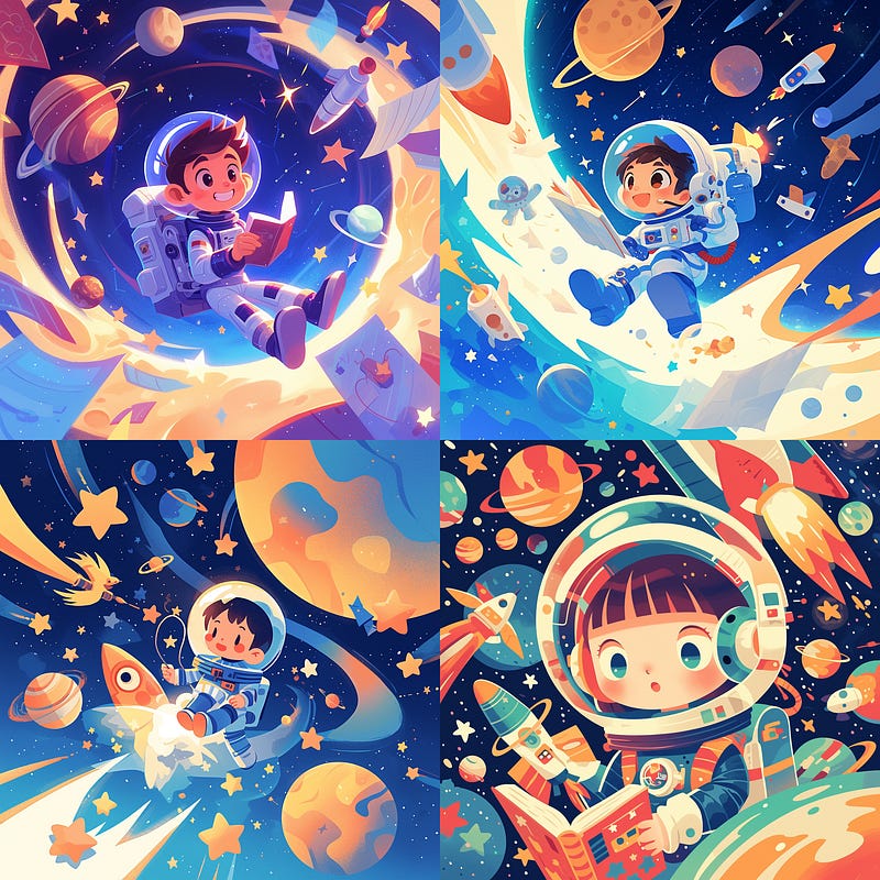 Astronaut kid playing in space with stars, planets, and rockets, style of book cover, low details, cute, kawaii, cartoon, kids — ar 16:9 — niji 6 — stylize 500