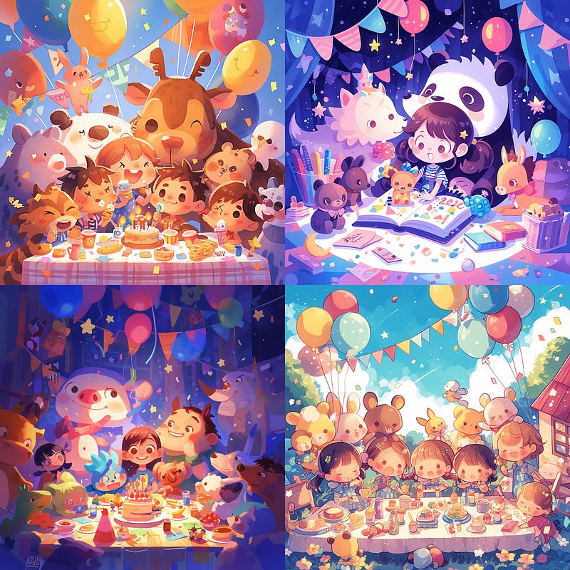 Children in a party with cute animals, ballons, lights, stars, style of book cover, low details, cute, kawaii, cartoon, kids — niji 6 — stylize 500
