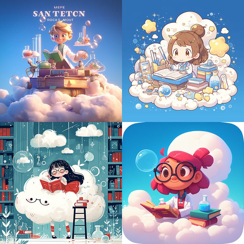 Science Girl playing in a cloud with cute books, lab objects and happy bubbles, style of book cover, low details, cute, kawaii, cartoon, kids — niji 6 — stylize 500