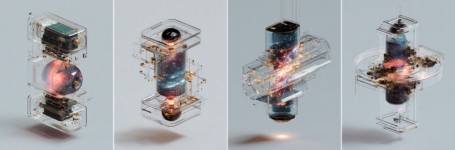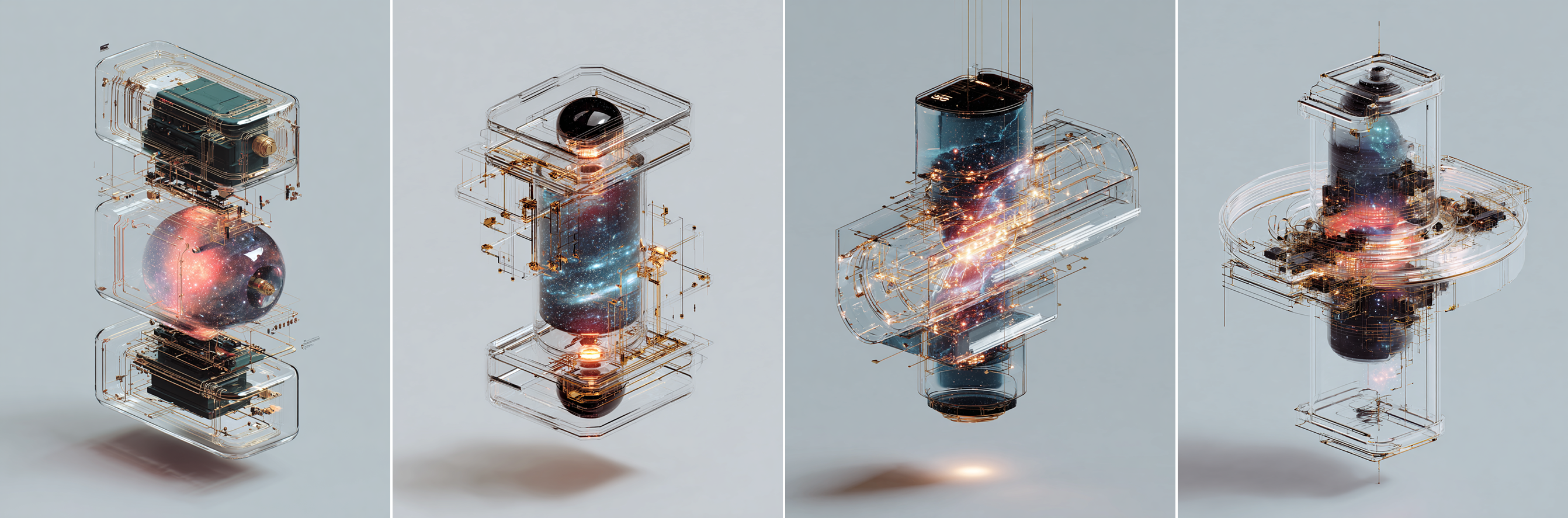 Initial Midjourney prompt: Transparent Tensor Core with a galaxy inside, isometric, visible complex energy circuits, isometric view, holographic product design, maximalism, in the style of Teenage Engineering, Spacepunk, transparent surfaces, plain colored background, levitating, suspended mid-air, studio lighting, hyper-realistic, Unreal Engine, Octane render, Zbrush --chaos 10 --ar 3:4 --exp 10 --sref 257047628 --stylize 1000