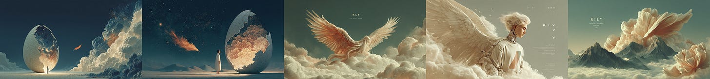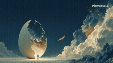Initial Midjourney prompt: a lone figure emerging from a colossal cracked, obsidian egg, shimmering with cosmic nebula patterns inside. The background is a stark, dark landscape under a sky filled with distant galaxies. a single vibrant phoenix feather drifts down. Cinematic lighting, hyperdetailed, sense of profound rebirth. --chaos 10 --ar 16:9 --exp 10 --raw --sref 2159285406 --profile ifaowni --sw 300 --stylize 1000
