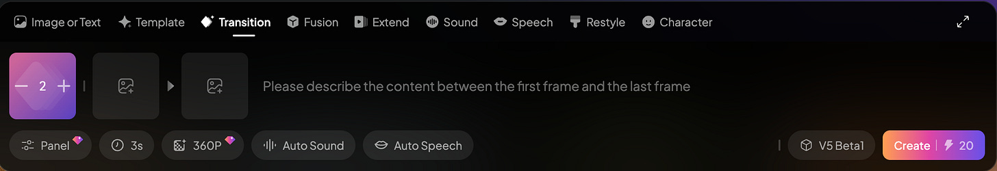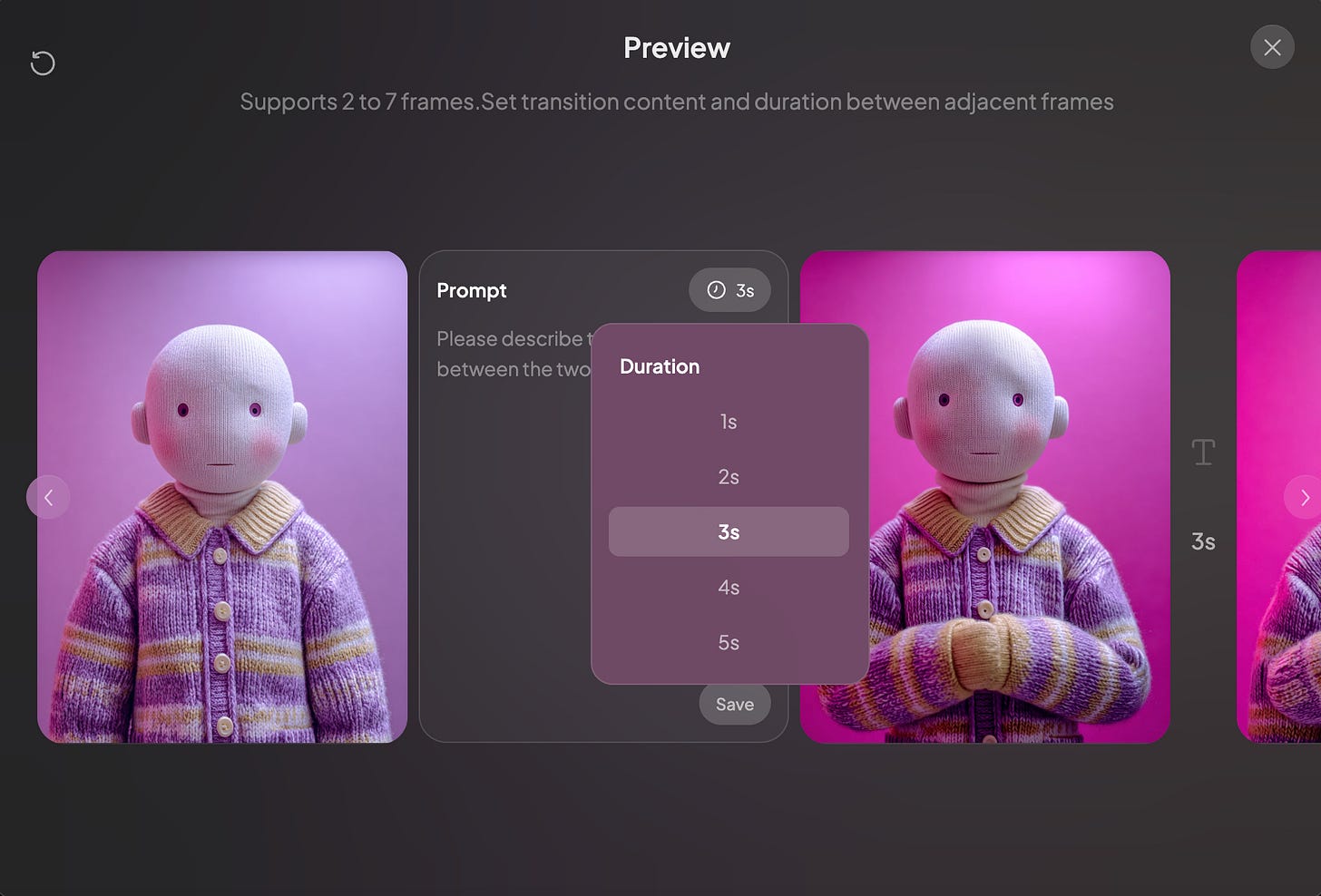 By clicking the text icons between each frame, you can open a prompt box. Here, you can describe the action that should happen between those two frames and even control the duration of that specific transition.