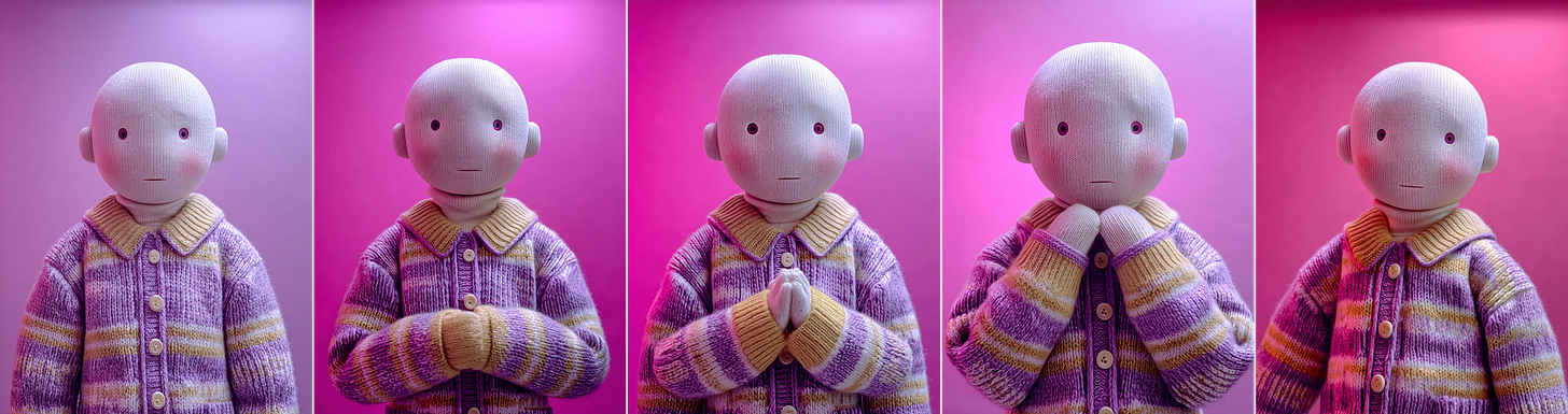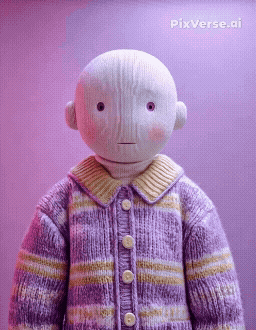 Initial Midjourney prompt: A bald doll wearing a purple and yellow striped sweater showing hands, against a solid color background with pink tones, in a simple design, with a close-up front view, soft lighting, and a cute expression, creating a warm atmosphere. --ar 3:4 —chaos 10 --sref 3386211438