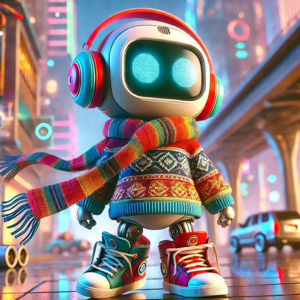 A cute high-tech tiny robot wearing a colored sweater and pants, street shoes, flowing scarf, in the style of colorful illustrations, cartoon characters, 3D animation design, with a sci-fi urban background