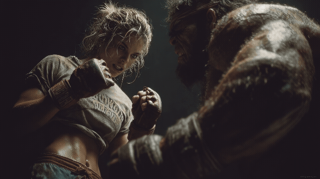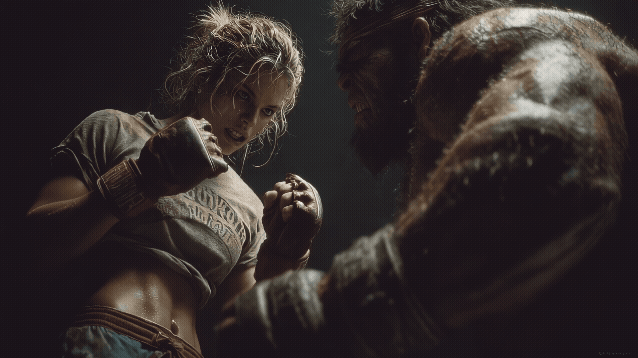 WoooHoo! The animation played out exactly as I had hoped. The woman delivered a swift right, followed by a powerful left hook that sent the hulking man reeling. It was the dynamic, controlled sequence I had been trying—and failing—to achieve with text prompts alone.